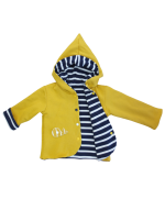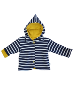 Cette veste à capuche rayée est réversible pour offrir deux looks en un en divers coloris. Elle est également évolutive puisqu'elle est conçue pour être portée par l'enfant environ 2 ans. Confortable est pratique, les enfants l'adorent car avec, ils peuvent apprendre à s'habiller tous seuls.